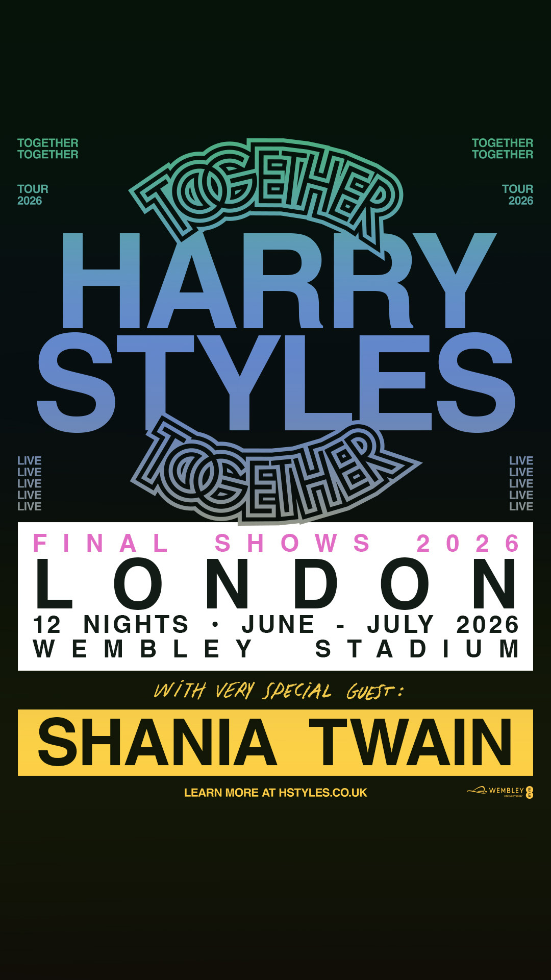 Announcing dates at Wembley, Harry will be delighting fans this summer with special guest Shania Twain, when he starts the UK leg of his ‘Together Together’ tour on 12th June, in London.